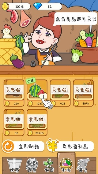 3、在付出辛勤努力之后,不妨去“市场”看看,点击货物就能简单地将其转化为收益,获取属于你的第一笔资金。