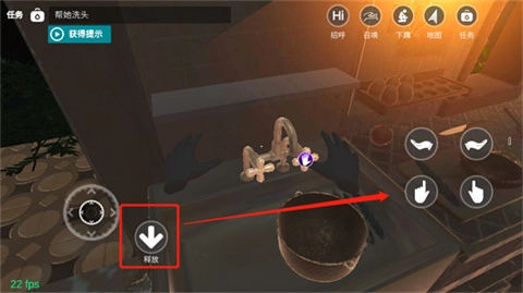 4、操作界面左侧的摇杆用于控制移动方向,玩家拖动屏幕就能转换视角;右侧的功能按钮从左到右、从上至下依次是“给”“索取”“用左手拿”“用右手拿”。界面右上角的“召唤”按钮可让小忍跟随玩家行动。