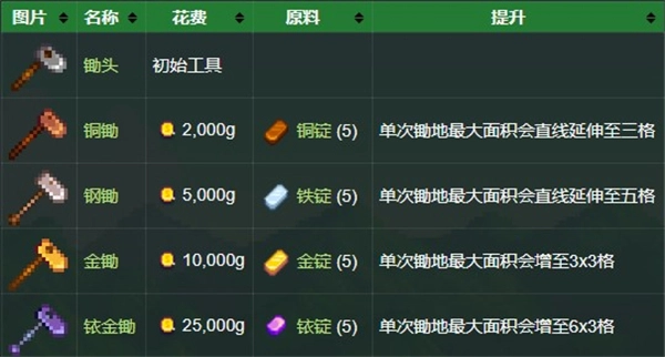 玩家能用锄头进行挖土和耕种操作。当锄头完成升级后,长按左键蓄力便能一次性锄开一片土地,锄地的面积会根据锄头的等级以及蓄力时间的长短来决定。此外,锄头还可用于挖掘远古斑点,以此获取隐藏的物品。
