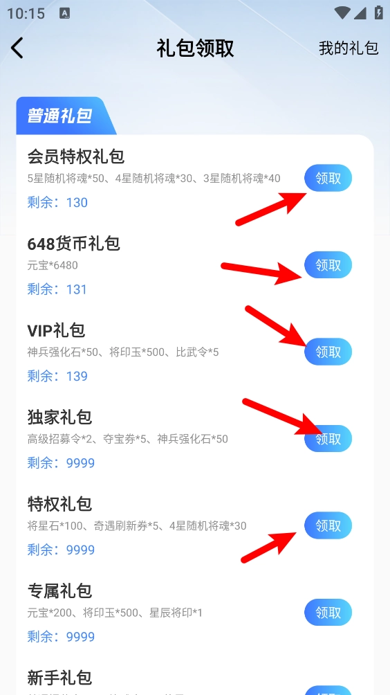 3、进入后会看到多个礼包资源,点击右侧的“领取”按钮就能获取。