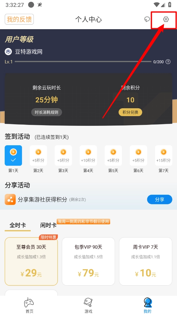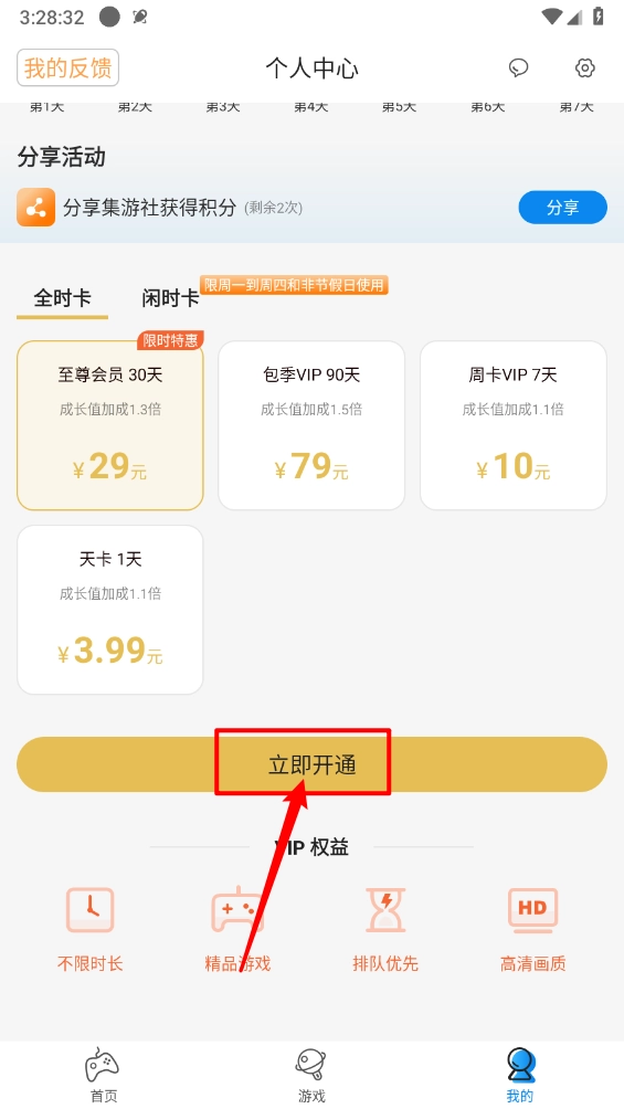 2、进入个人中心页面后滑动至最底部,开通VIP即可享受无限试玩权益。