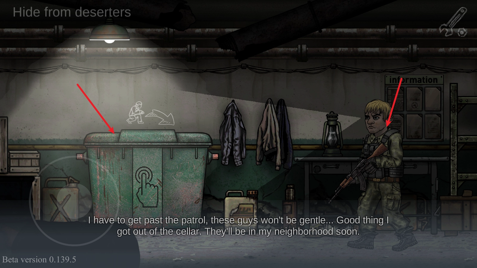 2、按照任务提示,我们抵达了避难所。因为是悄悄潜入的,所以得避开巡逻兵。场景里有不少能用来藏身的物品,像这里点一下就能躲进去,以此来避开巡逻兵的搜查。