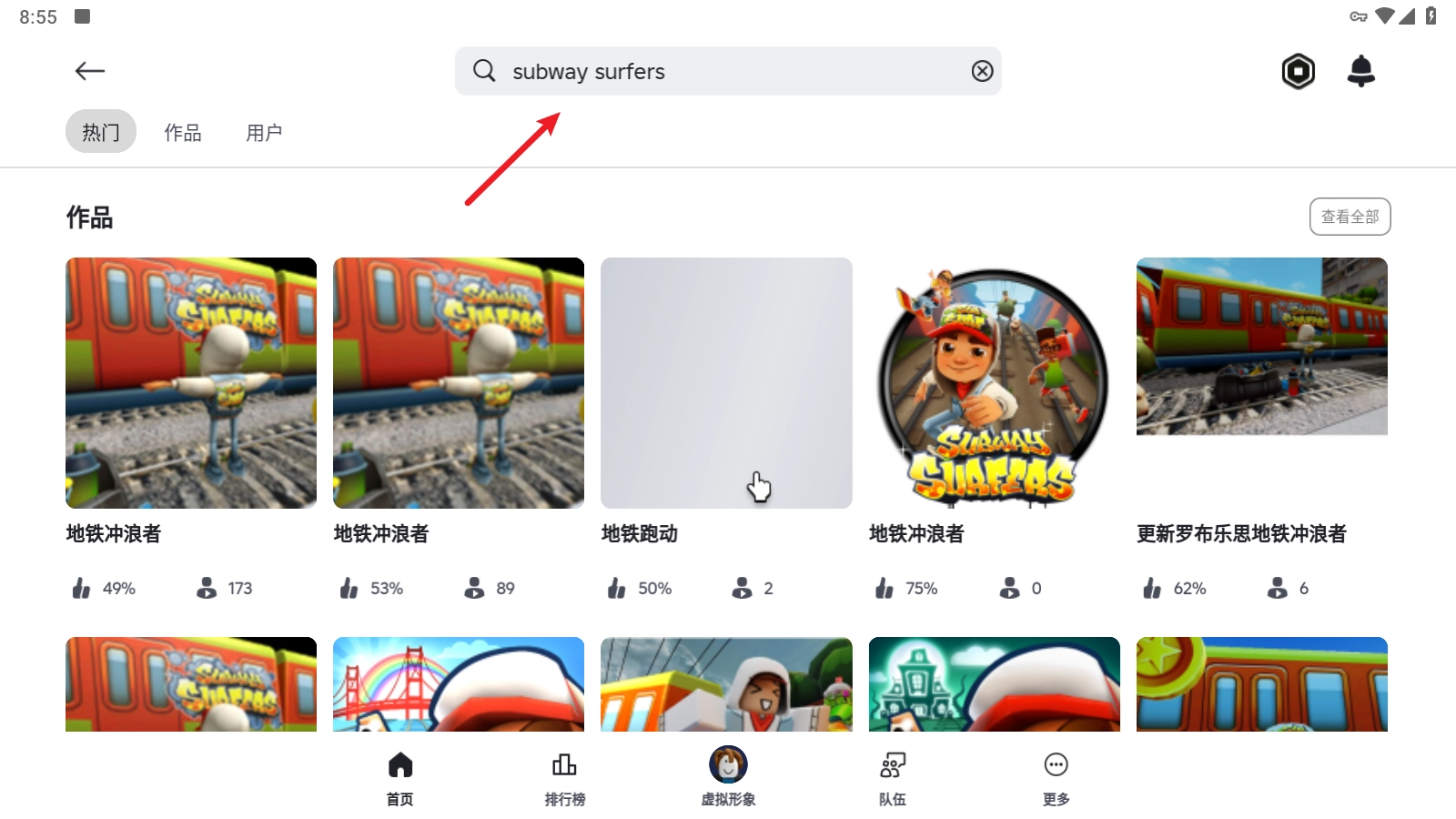 1、成功登录后,我们可以在上方搜索“subway surfers”,这样就能看到不少地铁跑酷相关的模组了。