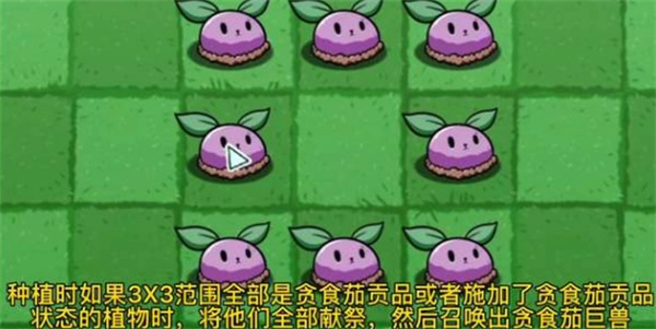 1、种植时,只要3×3范围内全是贪食茄贡品,或是被施加了贪食茄贡品状态的植物,就能直接召唤出贪食茄巨兽。