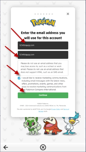 3、在图中的输入框中输入两遍相同的邮箱,接着勾选下方的同意选项,再点击继续按钮。