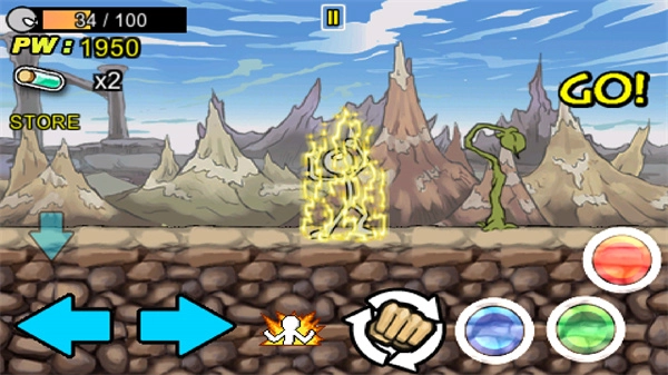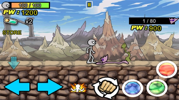 2、右侧最上方的按键是跳跃键,最左侧的按键可通过脚部发动攻击,其旁边的按键则能使用拳头进行攻击。