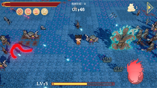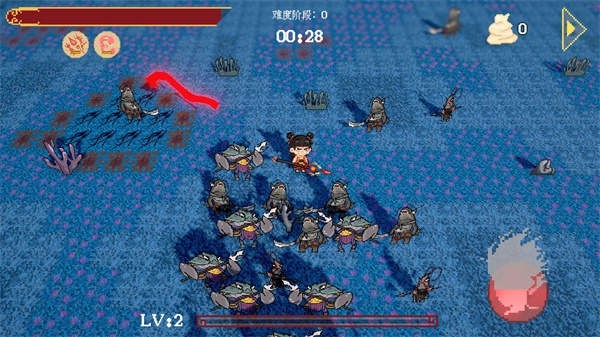 2、玩家需要操控角色在妖怪群中移动并展开战斗,通过消灭妖怪来获取更多技能,同时还能收集莲藕,用于提升各类天赋等级。