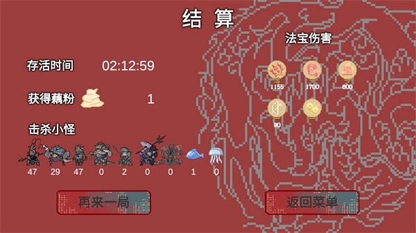 3、战斗设计采用无尽挑战模式,玩家需持续消灭敌人并升级法宝,以此应对不断变强的敌人,一旦角色血量归零,闯关即宣告失败。