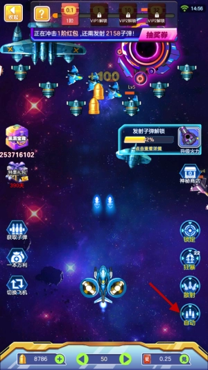 1、点击飞机即可开始射击,也可开启右下角的自动射击功能。