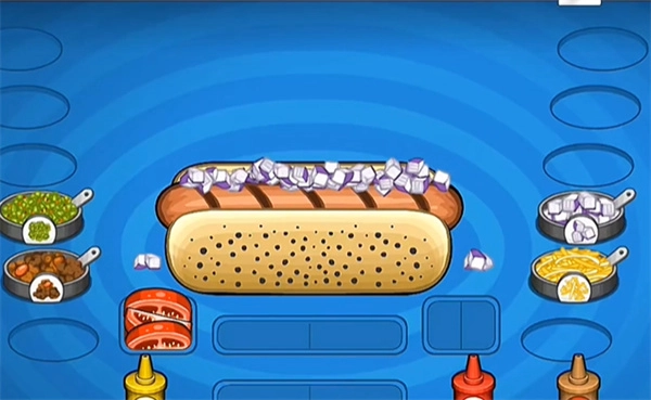 3、热狗烤好后,接着去加些调料和配菜,要记得都撒上,这样能拿到高分。