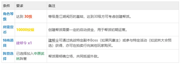 要成功创建门派需要满足不少条件,而且这些条件都得全部达成,其目的是为了保证玩家拥有一定的实力和财力,从而能够带领门派实现快速发展。具体条件请参考下表: