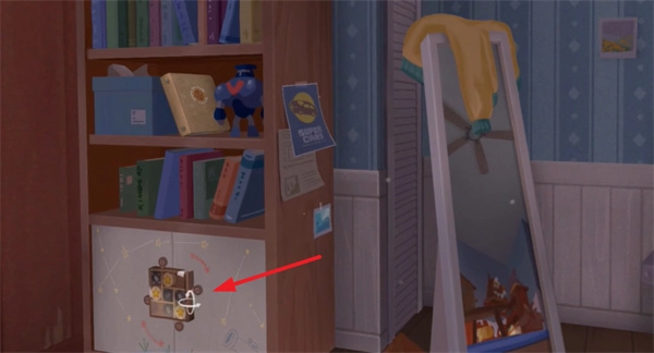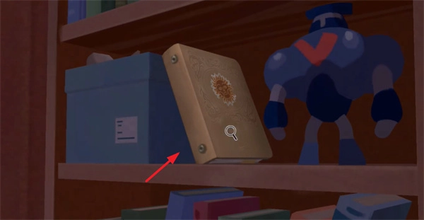 3、接着点击左侧的按键,即可直接切换场景,然后选择书柜下方的机关。