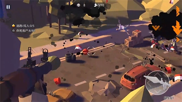 2、左侧按键用于操控角色移动,右侧按键可让角色持续使用武器发起攻击,目标是消灭规定数量的僵尸。