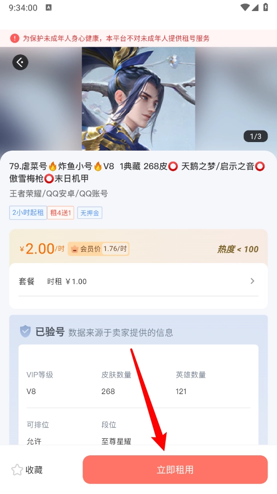 4、进入商品详情页后,可查看账号详情,点击“立即租用”按钮。