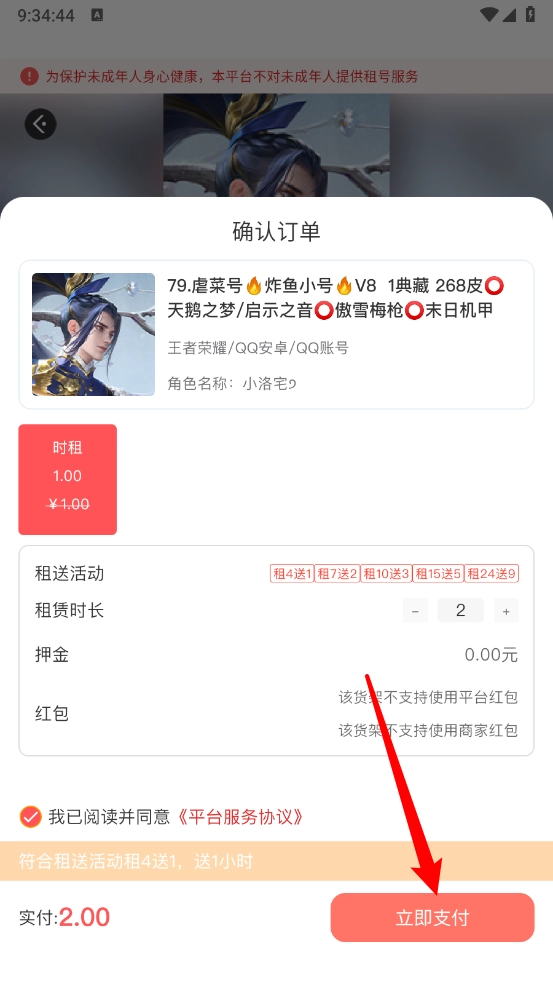 5、如图所示,选定租赁时长与服务协议后,点击“立即支付”按钮,支付完成即可登录账号畅快游玩。
