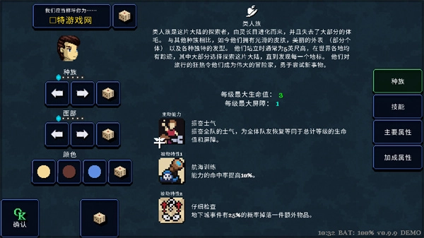 2、接着挑选合适的角色,同时确定种族、技能等设定,之后就可以开启闯关之旅了。