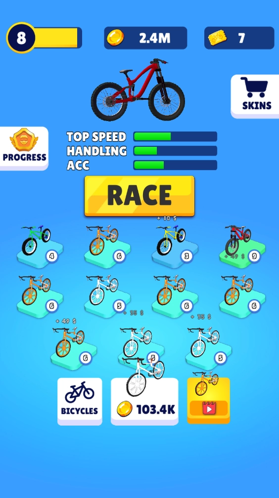 2、可以自由合成各式各样炫酷的自行车,挑选适合自己的自行车参与比赛,尽情享受胜利带来的喜悦。