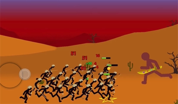 1、地图中的火柴人会自动向敌人发起攻击,玩家也可以选择一个火柴人进行直接操控,使其持续攻击敌人。