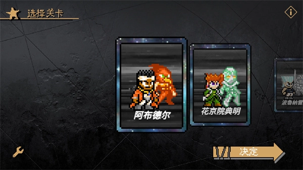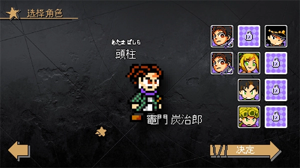 《jojox洛克人》(jojoXrockman)是B站UP主“孟队”制作的洛克人同人作品。它采用经典的像素风格,还融入了炭治郎、空条承太郎等众多角色。玩家只需挑选一个角色,就能挑战关卡里的BOSS——这些BOSS各有独特能力,战斗时要留意躲避攻击。
