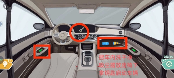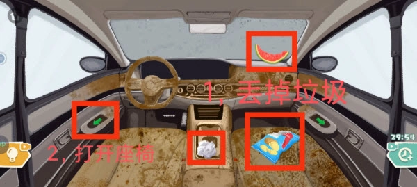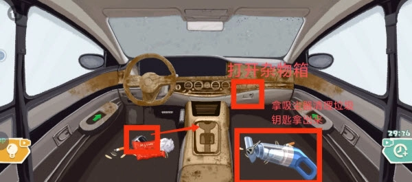 2、接下来点击左侧的绿色按钮,继续清理座椅下方的垃圾。副驾驶的抽屉打开后,里面的垃圾也需要清理,可使用蓝色吸尘器进行吸取。