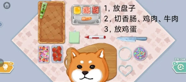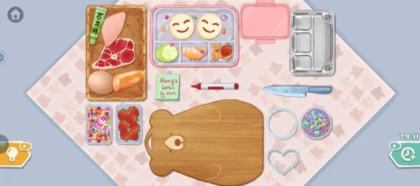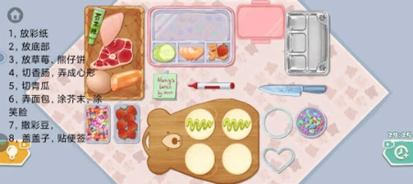 1、关卡第一步要把右下角的亮片撒到便当盒底部,再把玻璃便当盒放进去。