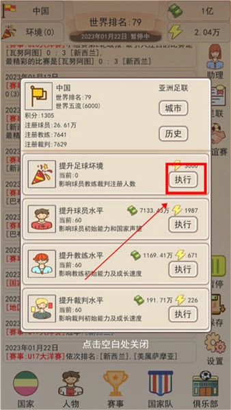 3、点击左下角的国家按钮,能够提升足球运动的各项能力。