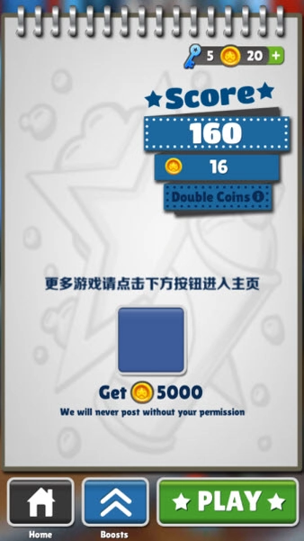 4、时刻注意躲避障碍物,撞到就失败了。