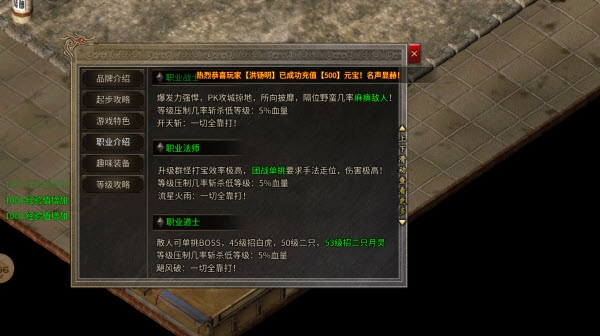 3、新人背包包含宝宝卷,能辅助新手开荒,完成任务还可获取金币和经验卷!游戏实现三职业平衡,玩家可双开账号——战士负责PK,道士专注打装备,法师则刷材料并通过拍卖行,收购散人玩家打到的聚灵珠、金条、装备与各类材料!