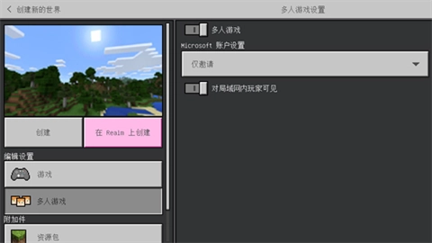 2、点击“新建”,选择“创建新世界”。创建世界的各项设置可根据个人喜好自行调整,但多人相关设置务必开启,同时要打开“对局域网内玩家可见”这一选项;Minecraft账户设置建议设为“仅邀请”,以防其他玩家随意进入。