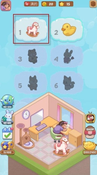 1、进入关卡后,点击房间里的这个箱子,就会随机出现各种家具和物品。
