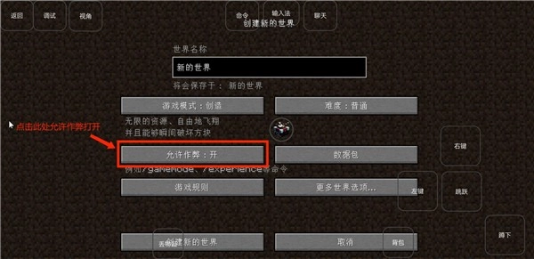 1、创建世界时,需先将“允许作弊”设置为开启状态,之后再点击创建世界。