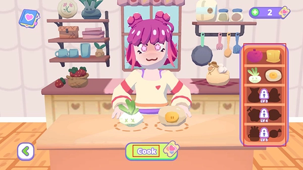 4、可爱的小伙伴还会烘焙食材哦,只要选择右侧的两个菜品,点击下方cook,小伙伴就会自己制作啦,完成后同样可以获得金币奖励。