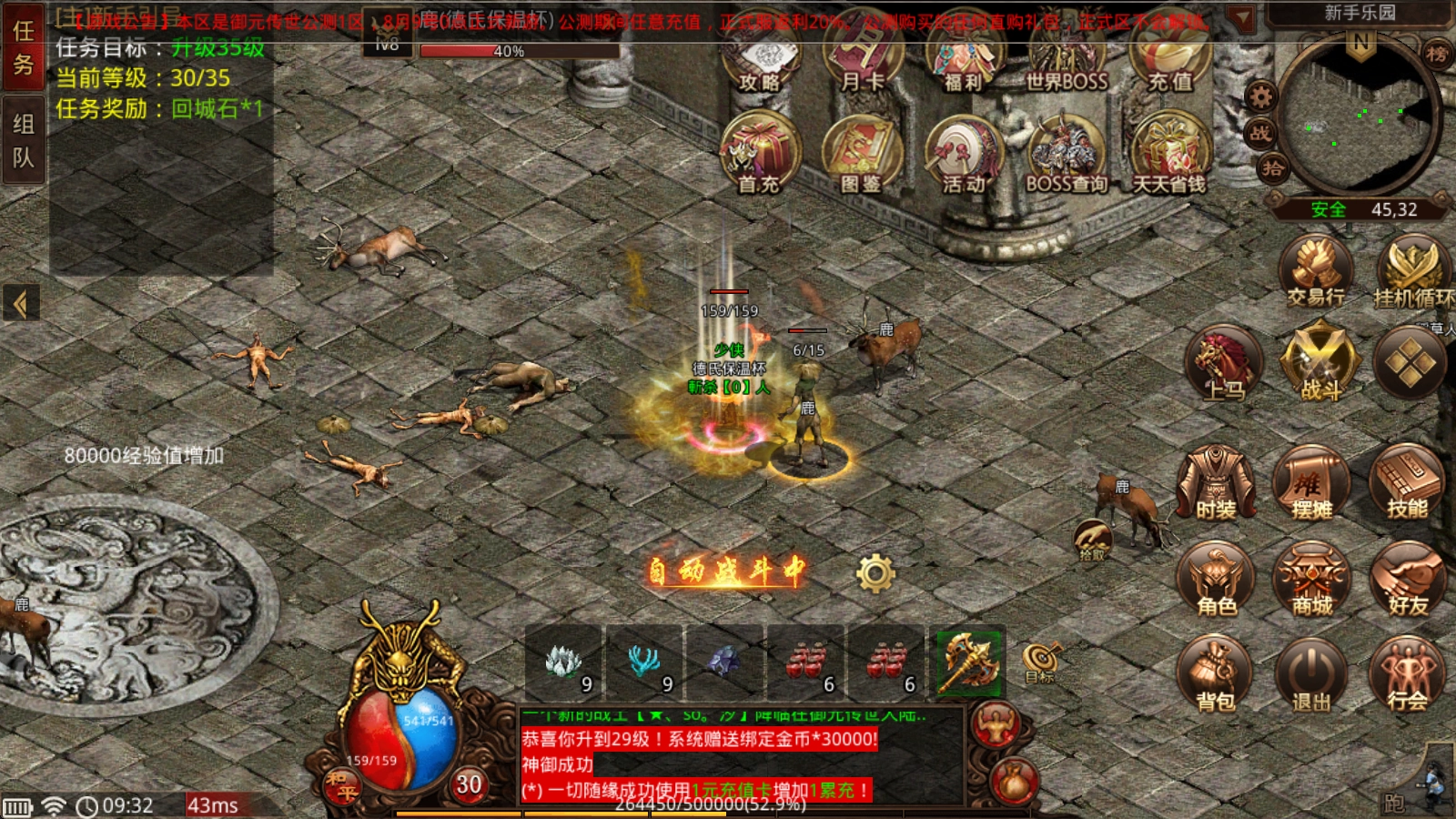 4、我要元宝:本服区域精英及以上级别的怪物都能爆出绑定充值卡,世界boss必定掉落不绑定的高级充值卡!