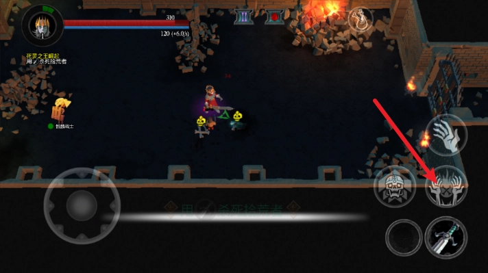 3、进入场景后,左侧摇杆用于控制移动,右侧的攻击指令可用来击败拾荒者。