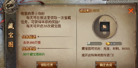2、完成新手引导任务后,去接取藏宝图任务,接着依据自身战力进入对应地图击杀小怪,累计消灭300只小怪就能完成该任务。获得的藏宝图碎片可到藏宝图NPC处合成完整藏宝图,开启后能获取大量元宝、灵符和各类材料!