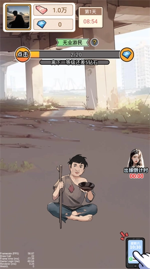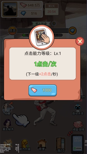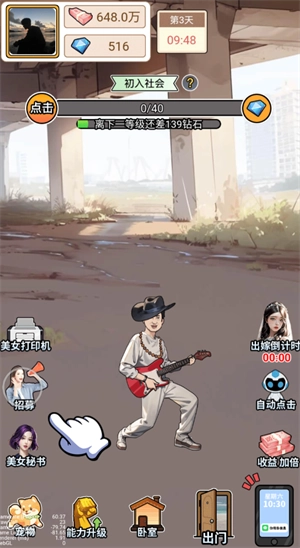 1、点击屏幕乞讨可以获得金钱,提升地位