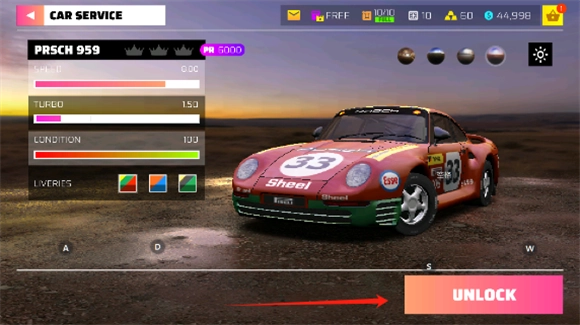 2、挑选你喜爱的车辆,点击右下角的unlock按钮完成解锁购买。
