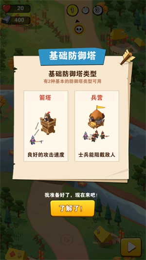 1、选择一款基础防御塔来布防:箭塔攻速较快,兵营可部署士兵拦截敌人,法师塔伤害高且具备物理穿透效果,炮塔则能造成范围伤害。