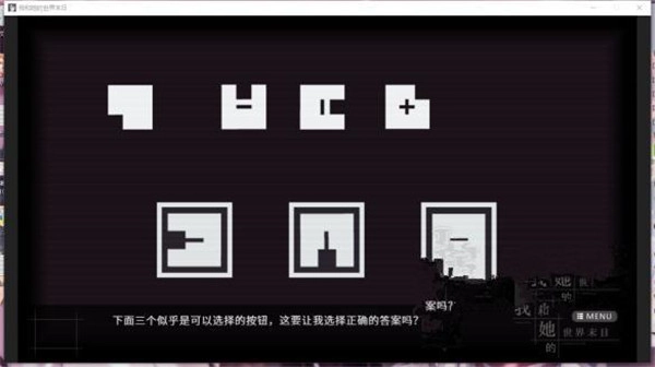对 就是箭头指的这个,为此你只需要选择下面的图形作为答案就能成功解谜了。 以此类推,左上角出现哪个图案就选择那个图案下面的图形。 第四章女主给了男主一张纸条,上面写了: 【女主对男主的表白】may be like you。