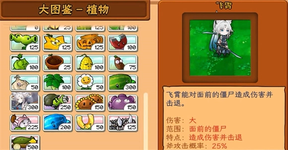 要解锁飞霄,得先获取大嘴花植物。拥有大嘴花后,在关卡的植物选择界面向下滑动,就能找到飞霄了。飞霄的种植需要消耗300阳光,它是近战类型的植物,第三下攻击会将僵尸击退,并且攻击过程中有25%的概率触发技能,该技能同样具备击退僵尸的效果。