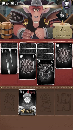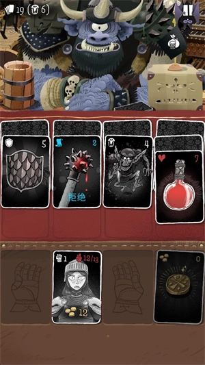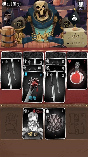 3、处于最下方的角色卡牌是你的英雄,英雄卡牌的左右两侧为装备栏,除了怪物牌与金币牌之外,把其他卡牌拖动至装备栏就能使用。英雄牌左上角的数字表示可进行的行动次数,右上角的数字则是英雄的血量。