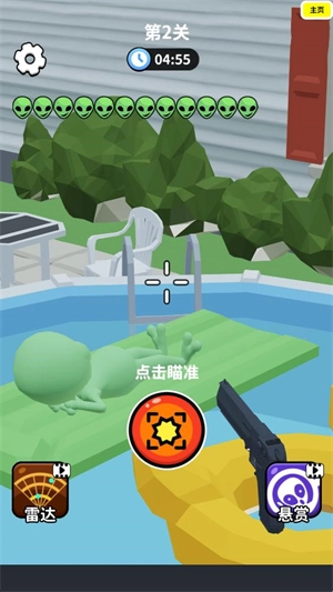 这款游戏的玩法和普通找茬类游戏不一样,玩家要找出隐藏的外星人,并用武器发射子弹消灭它们。每个关卡都有时间限制,你得在规定时间内把所有外星人都击毙才能通关。要仔细观察场景,寻找外星人的踪迹,通过完成各种挑战来体验别样的乐趣。