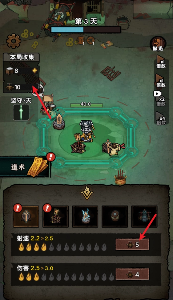 6、道士的上方显示着自身的血量,一旦血量耗尽,撤退便会失败,并且会损失已获得的部分资源。