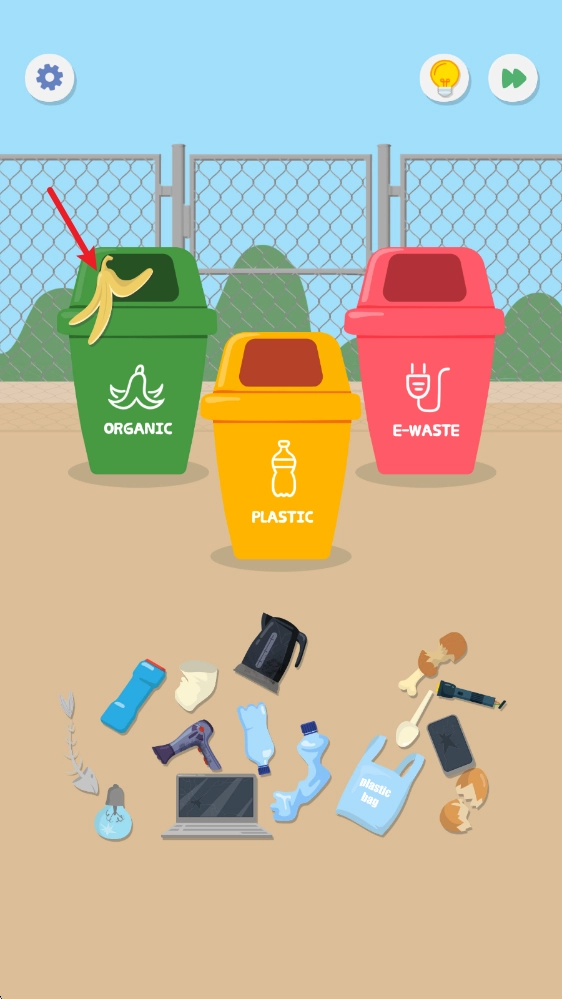 3、接下来需要按照垃圾分类的要求,将垃圾投放到对应的垃圾箱里,比如果皮要放入第一个绿色的垃圾箱中。