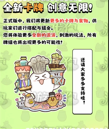 在游戏中,会更新更多卡牌与食物,让玩家们能够自由搭配和组合。你将体验到更多全新的流派与刺激的玩法,所有牌组也会涌现出更多富有创意的组合。