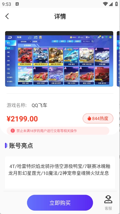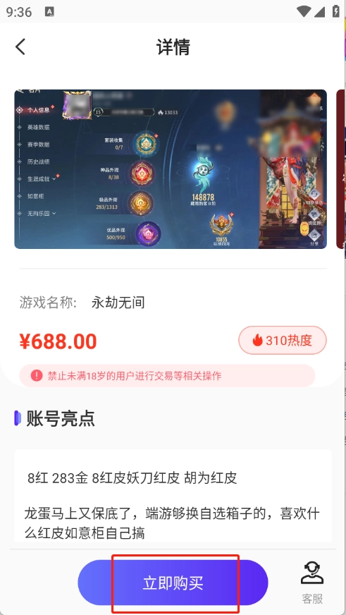 4、进入账号详情页,点击“立即购买”即可。