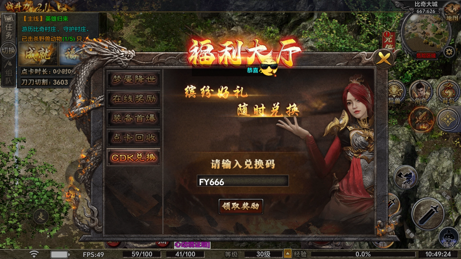 兑换方法:点击左上角的福利按钮,选择CDK兑换选项,接着输入礼包码就能完成兑换。