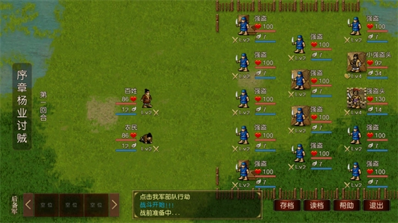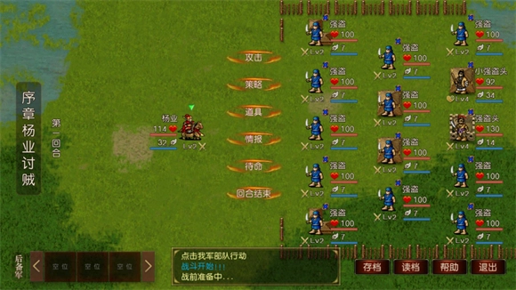 1、进入后,点击界面上的“征战沙场”即可开启新的征程,而“回阵杀敌”则是用于读取已有的存档。