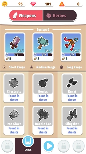 6、在主界面点击“cards”按钮可查看已解锁的武器,点击相应武器后,消耗金币与经验即可对其进行升级。