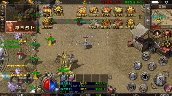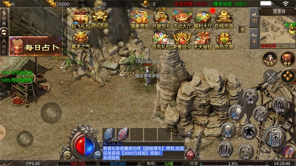 2、前期建议选择法师或道士职业起号,这两个职业可以通过拉扯BOSS的方式进行战斗。接着跟随引导任务完成后领取奖励,再去拉镖获取充值红包,之后开启土城右下方的泡点功能,最后激活狂暴之力。